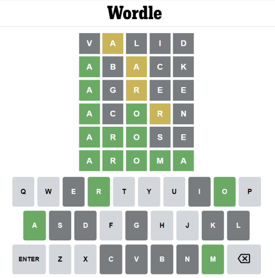 于是在第三次尝试中,我们输入了由A打头的“AGREE”,并得到了关于黄色字母R的新线索。