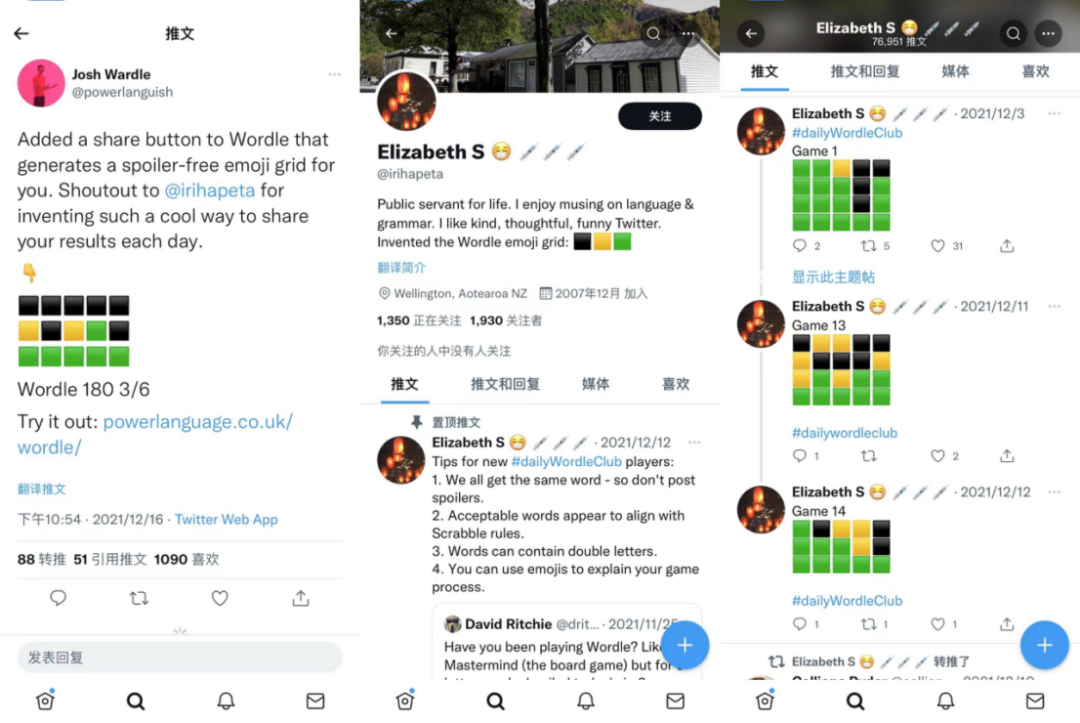 (网友们正在国内外互联网平台上“带Wordle冲浪”图源:小红书&Twitter&微博)
