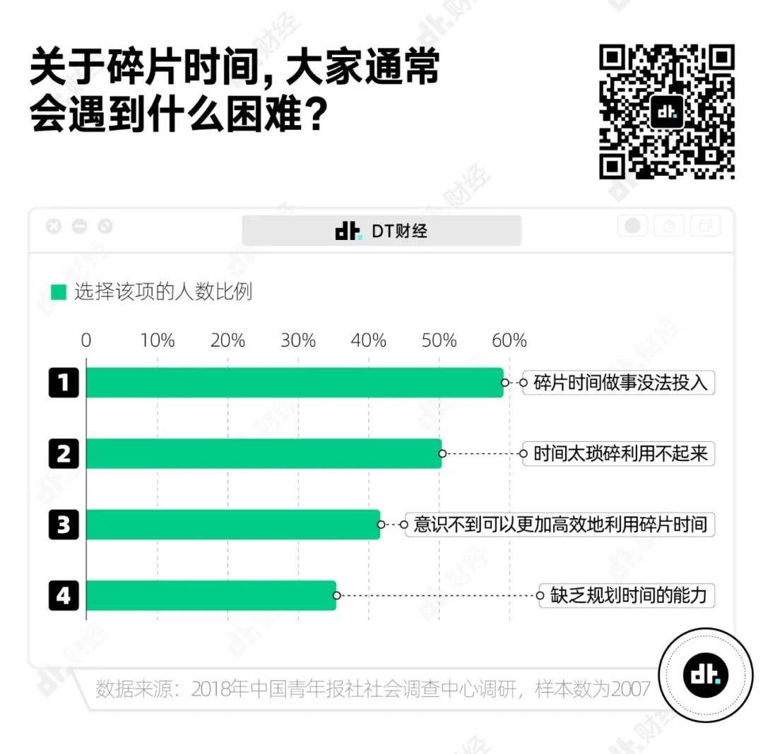 根据中国青年报社社会调查中心2018年对2007名受访者的调研结果,尽管有88.5%的受访者注意利用碎片时间,但59.1%的受访者觉得自己没法在碎片时间投入做事,还有35.4%的受访者直接坦言自己缺乏规划时间的能力。