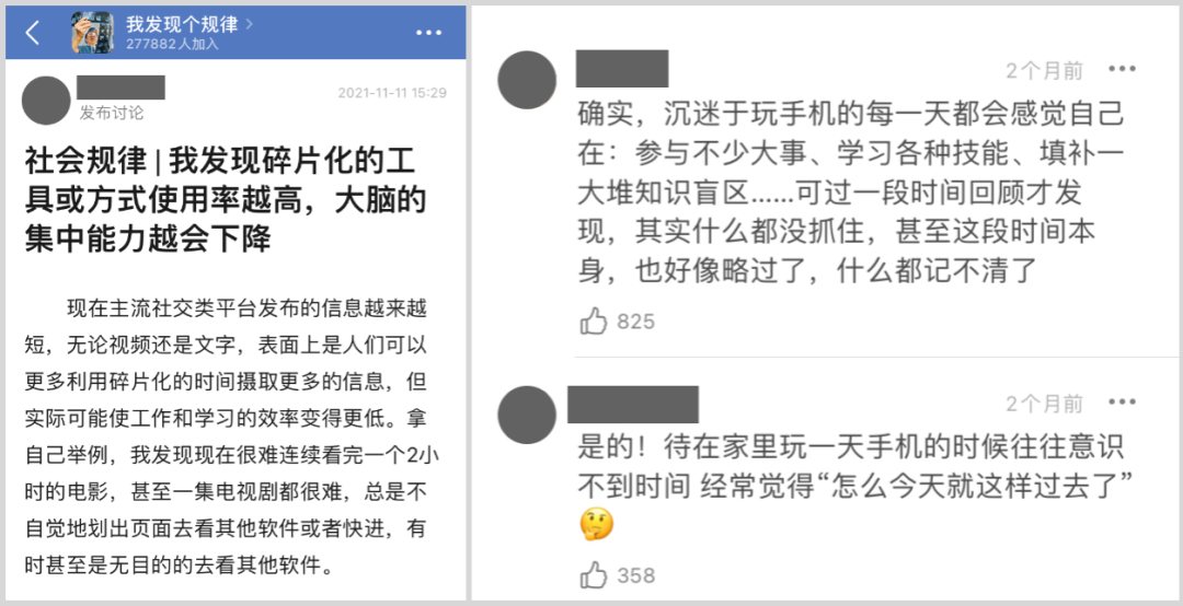 豆瓣小组“我发现个规律”中,也有不少组员意识到,碎片化工具看似让自己更方便地摄入更多信息,但反而降低了自己做事情的效率和记忆力。时间究竟是怎么过去的,自己也想不起来。
