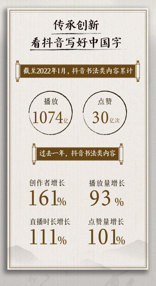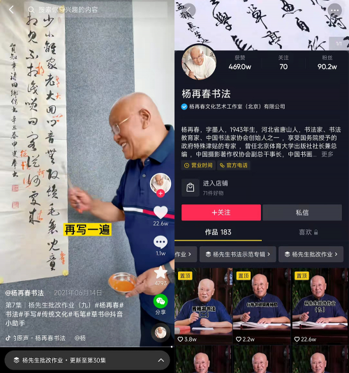 包括杨再春等书法家在内,近年来随着短视频和直播的普及,抖音正在成为用户欣赏、传播书法知识的重要平台。日前发布的《2022抖音书法数据报告》显示,过去一年,抖音书法类内容创作者增长161%,带动观看和点赞量分别增长93%和101%。截至目前,抖音书法类内容累计播放1074亿,被点赞超30亿次。
