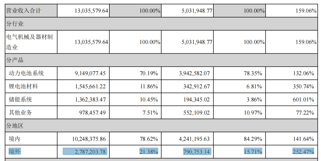 值得一提的是,宁德时代的海外市场持续发力。数据显示,2021 年,宁德时代海外市场的营收为 279 亿元,同比增长 252%,远高于国内市场的 142%;营收占比也从 15.71% 提升到 21.38%,增加了 5.67pct。