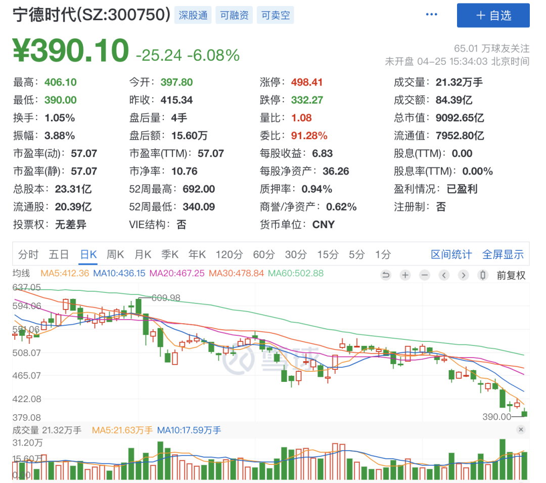 最近,宁德时代在二级市场正遭遇「退烧」,市值跌破万亿。4 月 24 日晚间,宁德时代发布公告称,原定于 4 月 28 日披露的一季报,推迟至 4 月 30 日。4 月 25 日收盘,宁德时代的股价下跌 6.08% 到 390.1 元/股,总市值为 9092 亿元。