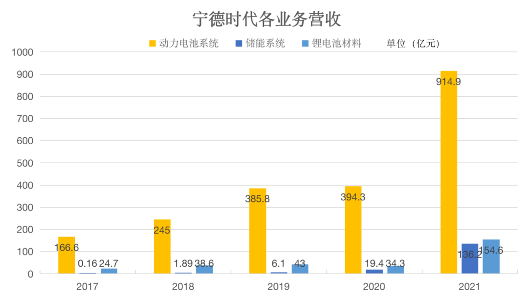 在宁德时代的三大业务中,动力电池系统是最重要的业务,市场也最为关注。财报数据显示,2021 年,动力电池系统的营收是 914.9 亿元,同比增长 132%,占总营收比例为 70.19%。
