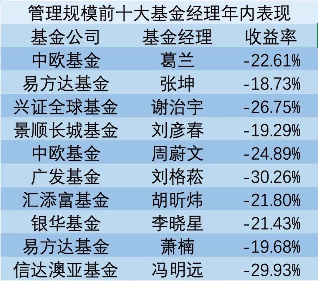 Wind数据显示,目前在管规模前十大的基金经理,年初至4月24日,回撤最低的是易方达基金的张坤,回撤了18.73%;回撤最高的则是广发基金的刘格菘,回撤高达30.26%,其余8位基金经理的回撤平均都在20%以上。