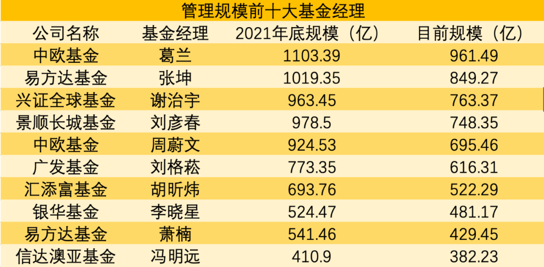 目前偏股型基金中管理规模最高的是中欧基金葛兰,其在管基金规模为961.49亿,与2021年第四季度末相比,缩水了142.9亿;其次为易方达基金的张坤,规模为849.27亿,环比缩水了180.08亿;兴证全球基金的谢治宇排名第三,管理规模为763.37亿,环比缩水200.08亿。