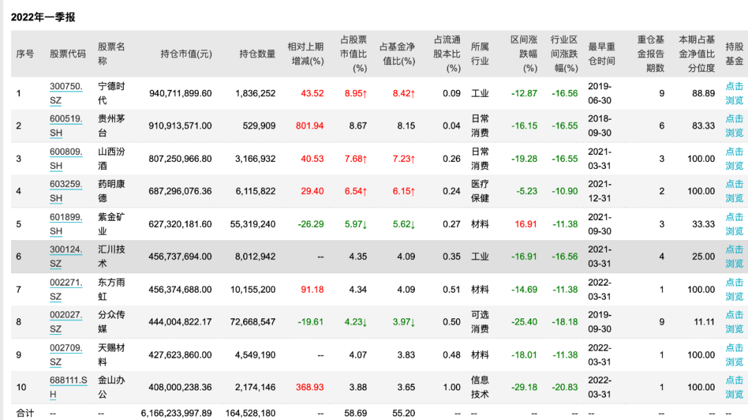 景顺长城基金的刘彦春一直坚定持有大消费板块,他所管理的6只基金在今年第一季度都减持了贵州茅台,加仓了五粮液。6只基金中只有景顺长城内需增长的重仓股中有宁德时代,在第一季度,刘彦春对“宁王”并没有调整仓位,选择了“以不变应万变”。