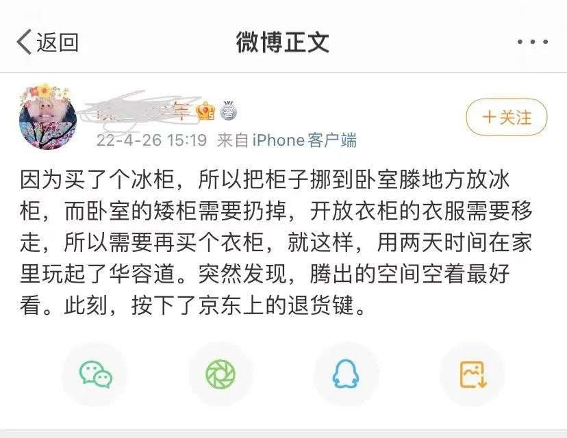 不过,是否购买冰柜还要根据实际需要而定。一位网友分享道:“因为买了个冰柜,所以把柜子挪到卧室,腾地方放冰柜。而卧室的矮柜需要扔掉,开放衣柜的衣服需要移走,所以需要再买个衣柜。就这样,用两天时间在家里玩起了‘华容道’。突然发现,腾出的空间空着最好看。此刻,按下了京东上的退货键。”