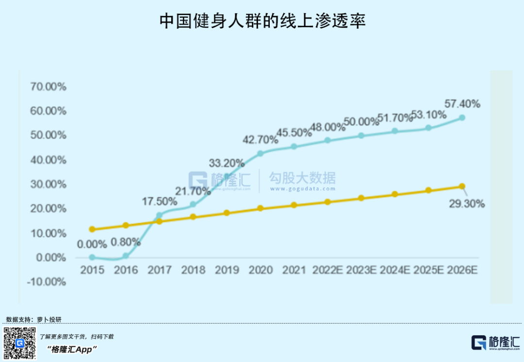 于是,刘畊宏选择做了自己擅长且喜爱的事情——健身直播,疫情之下,这也算个蛮火的风口,毕竟宅家后大家都有锻炼身体的需求,全民健身热潮慢慢兴起,而2021年中国健身人群的平均年支出为2596元,远低于美国的14268元,亟待发掘。