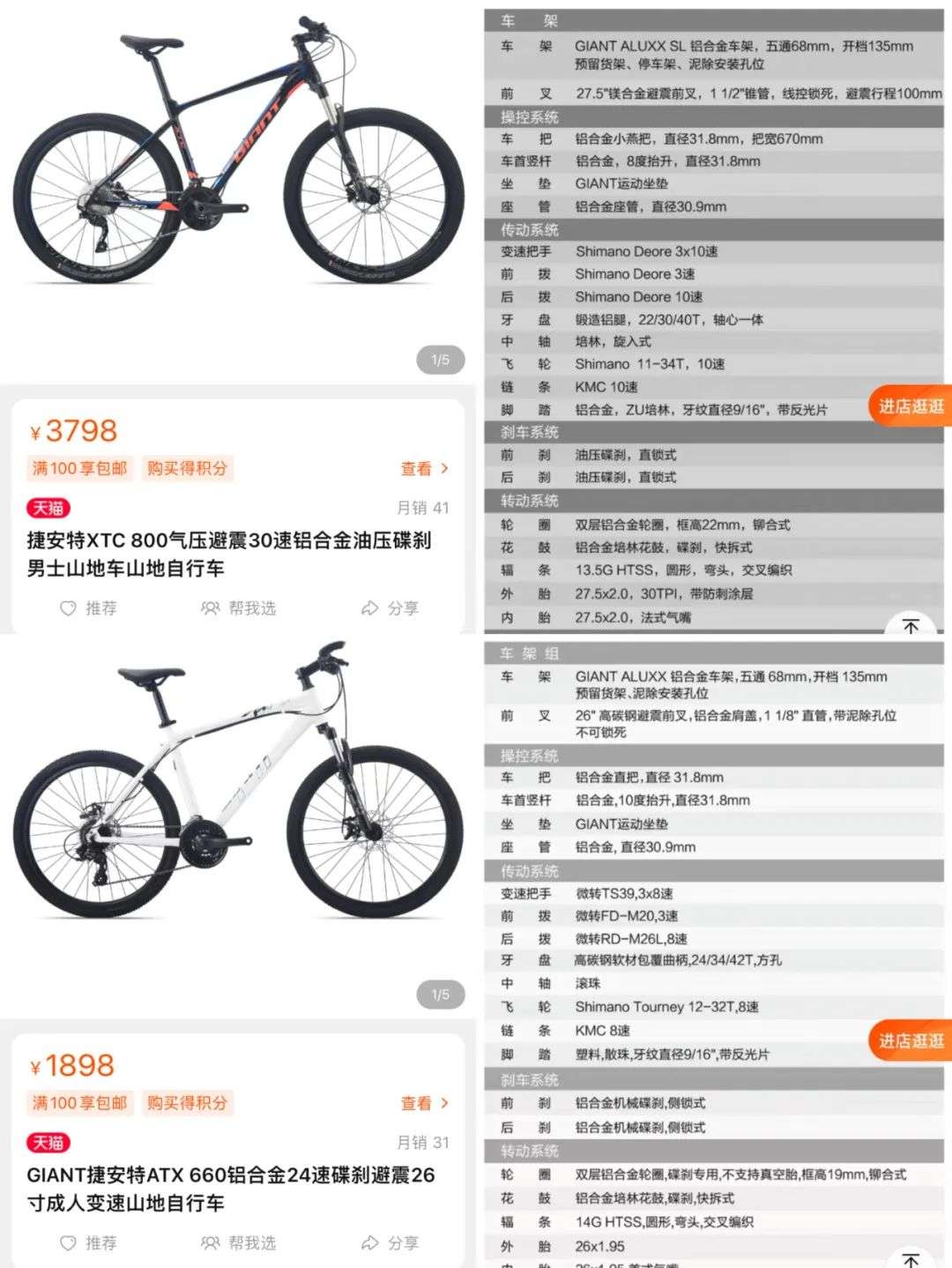 △捷安特热销的两款山地车XTC800和ATX680价格及相应配置,图:氢消费
