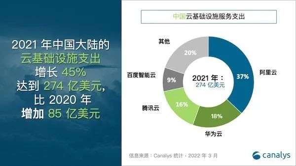 今年3月,Canalys 发布2021年中国云计算市场报告显示,中国的云基础设施市场规模已达274亿美元,由阿里云、华为云、腾讯云和百度智能云组成的“中国四朵云”占据80%的中国云计算市场。
