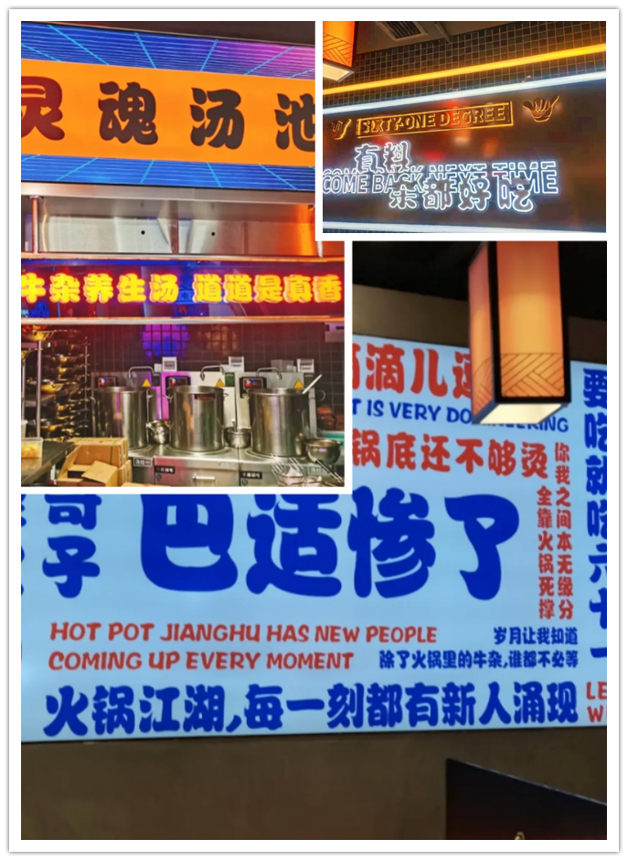 门店内更有一面大大的文案墙,上书“莫愁前路无知己,要吃就吃六十一”、“你我之间本无缘分,全靠火锅死撑”等由诗句、电视剧台词改编的有趣语句,整体氛围轻松、时尚。