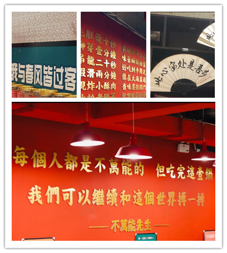 大堂内的墙壁上“每个人都是不万能的,但吃完这一锅,我们可以继续和这个世界搏一搏”一语双关。