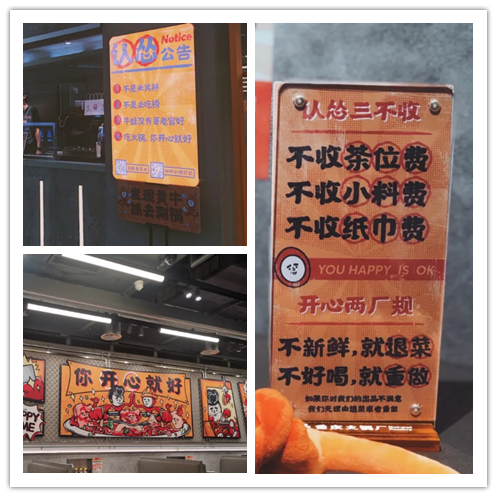“认怂公告”自曝其短,“认怂三不收”“开心两厂规”,还有餐具、员工服饰上“你说的都对,你开心就好”,将门店产品及服务,用带点自嘲的意味说出来,反而有了话题性和记忆点。