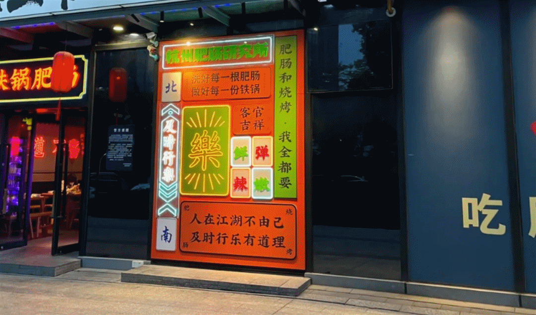 室内拐角处的“上有天堂,下有苏杭,我爱肥肠”,让顾客把城市和这家肥肠店联系在一起。
