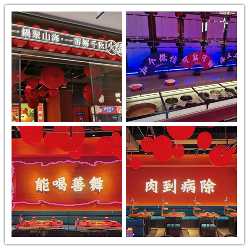 它的一家国风店有点像火锅酒肆,外围的“一锅聚山海·一醉解千秋”以及内墙上的“肉到病除、能喝善舞”,和吃肉喝酒的两大属性不谋而合。