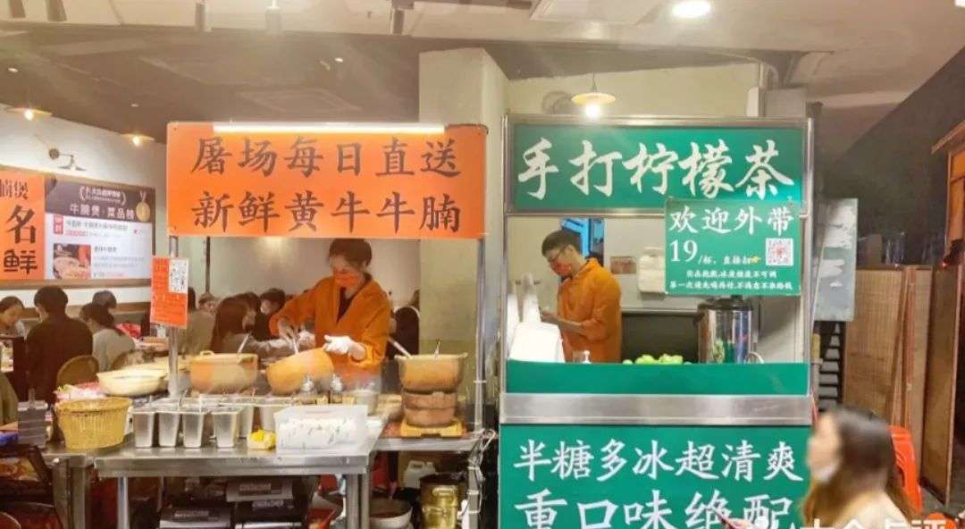 牛腩煲和柠檬茶两个档口处,用鲜明的大字告诉顾客“屠场每日直送新鲜黄牛牛腩”、“半糖多冰超清爽,重口味绝配”。