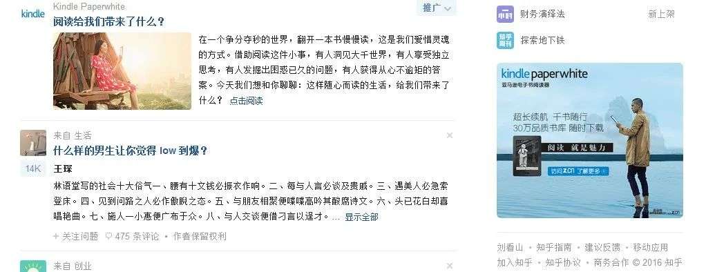 2016 年,几乎从来不打广告(至少那时候是)的知乎忽然在首页右侧出现了 Kindle 的推广,一度引发站内外一波讨论热潮;