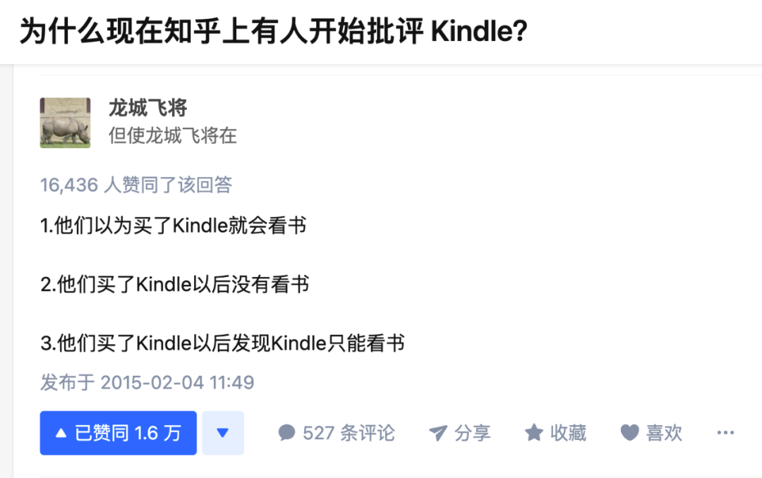 知乎上一则流传很广的段子,完美概括了很多「一时冲动」的 Kindle 购买者的心路历程: