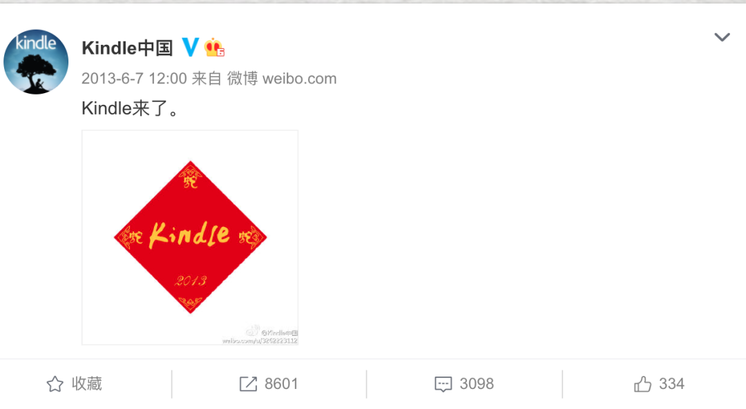 7 号中午 12 点,@Kindle中国 新浪官博成立,第一条微博「Kindle 来了」仅仅五小时就获得 8000 转发,2000 评论,粉丝直接突破 1.5w。