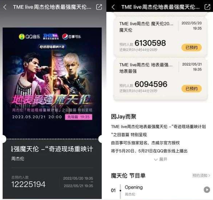 日前,腾讯音乐娱乐集团(下文简称为TME)旗下TME live宣布,将于5月20日至21日晚20:00直播周杰伦演唱会。不过此“直播”非彼“直播”,是通过视频号、QQ音乐等平台直播的形式,回放2013年“《魔天伦》”与2019年“《地表最强》”巡回演唱会的录像。