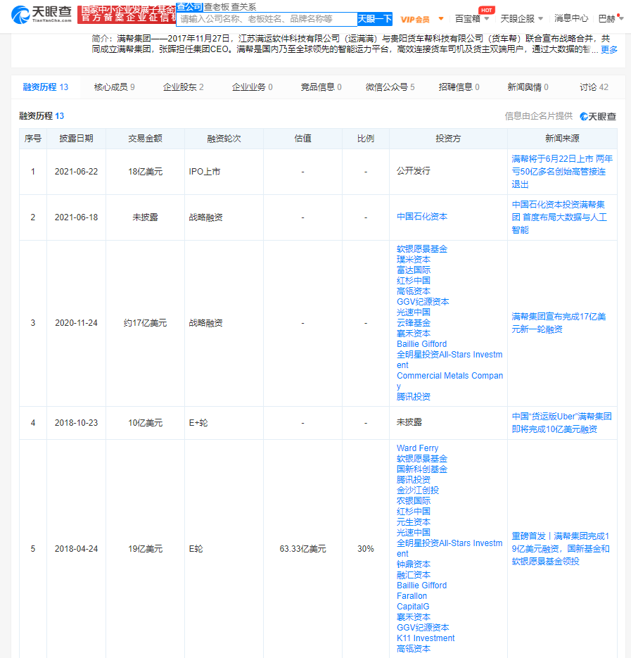据天眼查数据显示,满帮集团已于2021年6月在纽交所上市,募资16亿美元。
